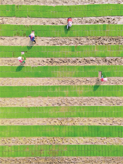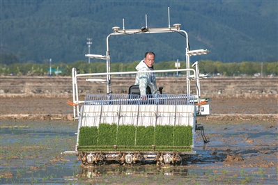 增城區絲苗米現代農業產業園的科旺絲苗米種植基地,農人正采用機器插秧。