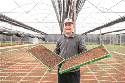 增城朱村街,農人將育秧盤搬至溫暖的大棚內。