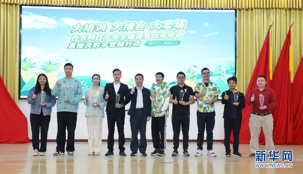 3月10日,主辦方籌備多日的2022年廣東“菠蘿的?!卑偾镱^直播開鑼暨全球采購商大會在徐聞舉行,邀請全國百名網絡直播高手到徐聞“菠蘿的?!迸e辦田園大學堂,通過師傅帶徒弟、“網紅”教果農直播帶貨,培養一手拿鋤頭、一手用手機,既會種菠蘿、又會賣菠蘿的“雙棲新農民”,打造帶不走的“菠蘿的?!敝辈I銷戰隊。