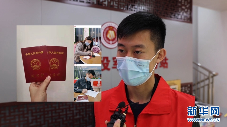 林杰是廣州市荔灣區龍津街退役軍人服務站的一名工作人員。因防疫人力緊缺,剛領完結婚證的他取消婚假,第一時間返回到防疫工作崗位。新華網發(張國榮 攝)