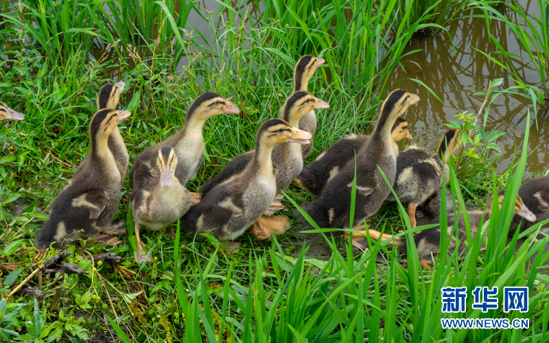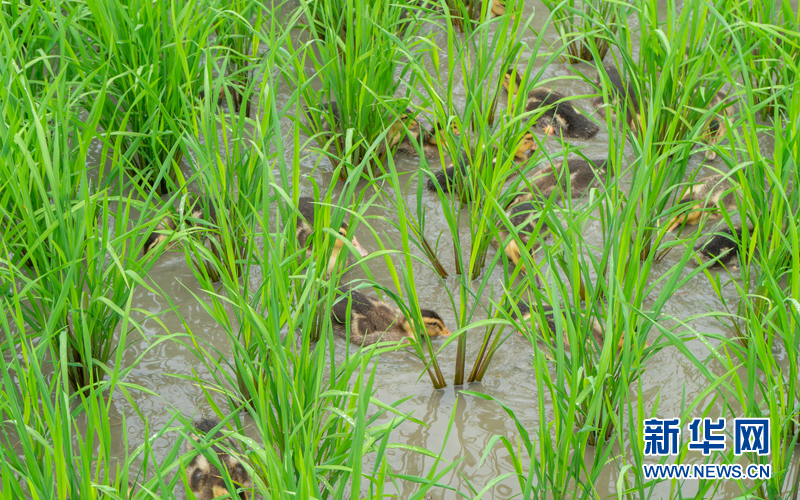 清風徐徐,禾苗搖曳生姿,小麻鴨進入水田后,三五成群地游走于禾苗間戲水。新華網發(邱其聰 攝)