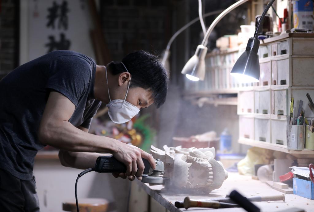 張偉潮在工作室雕刻龍頭。新華社記者黃國保 攝