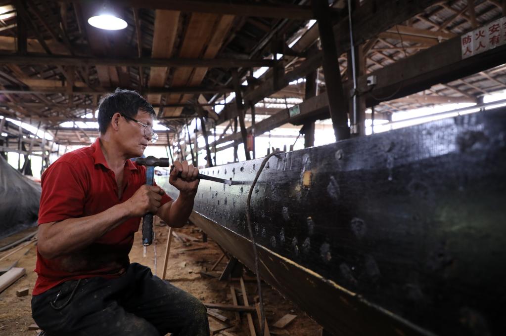工人們在船廠制作龍舟船身。新華社記者黃國保 攝