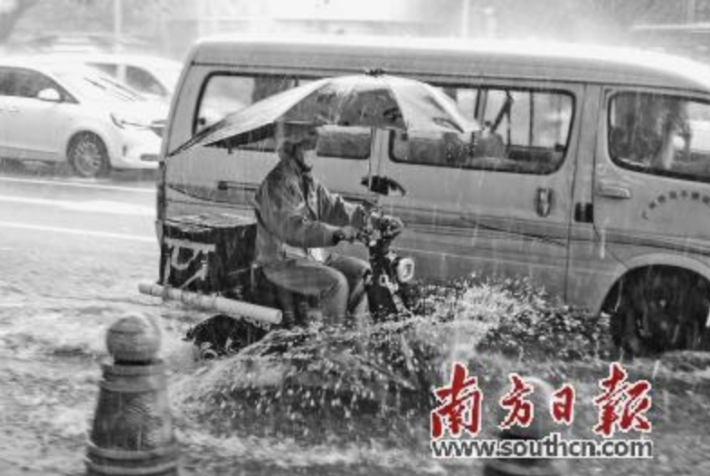 6月6日下午,廣州海珠突降大雨,外賣騎手騎著電動自行車,在路邊積水處掀起浪花。南方日報記者 符超軍 攝