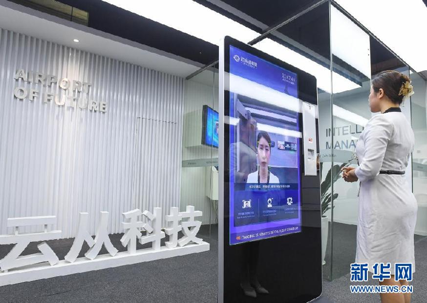 工作人員在廣州南沙云從科技展廳演示“智慧航顯”應用場景,該技術已經在北京大興國際機場等機場得到應用(6月15日攝)。新華社記者 劉大偉 攝