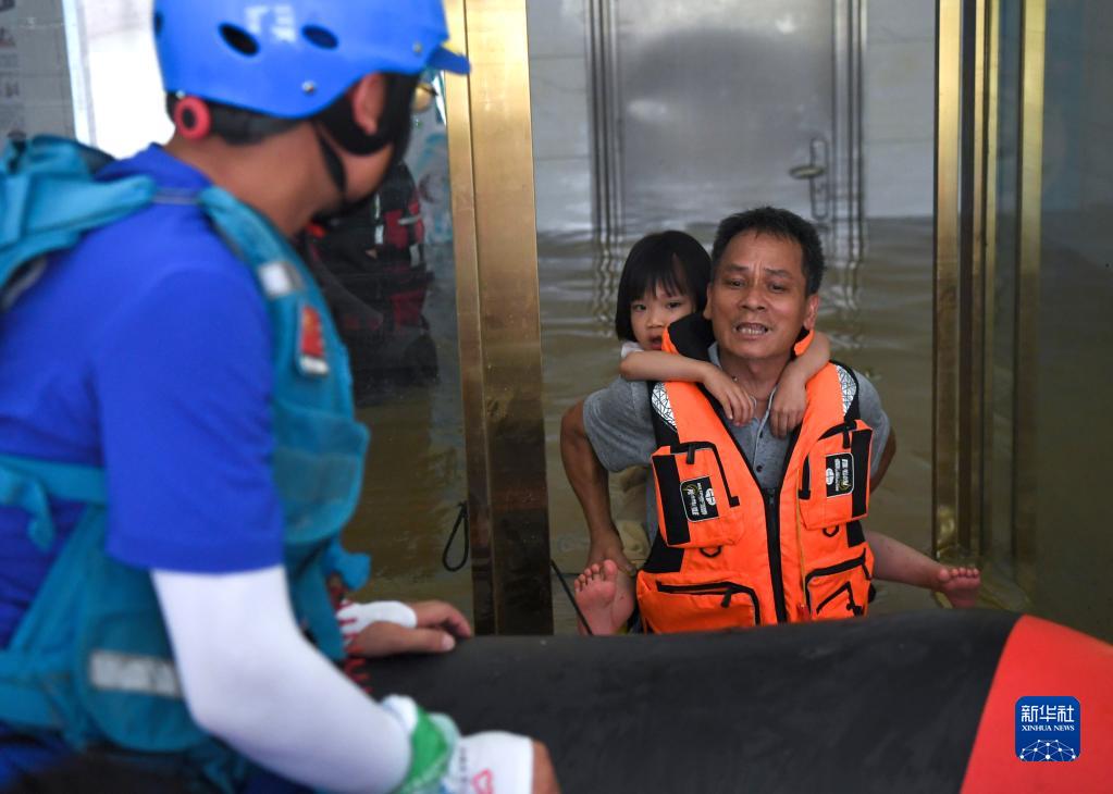 6月23日,在廣東清遠英德市浛洸鎮一棟被水淹的居民樓大堂內,救援人員(左一)用橡皮艇準備轉移群眾。新華社記者 鄧華 攝