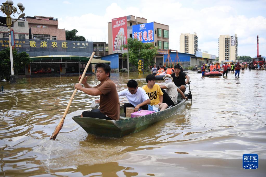 6月23日,在廣東清遠英德市浛洸鎮,群眾劃船運送人員和救援物資。新華社記者 鄧華 攝