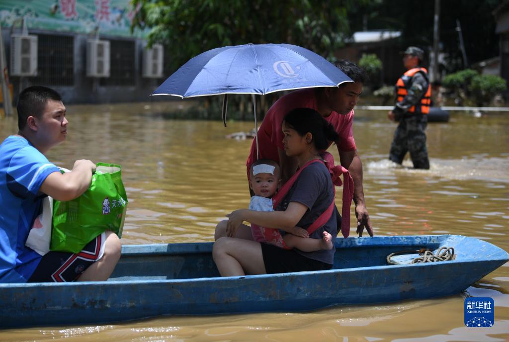 6月23日,在廣東清遠英德市浛洸鎮,群眾劃船轉移生病兒童。新華社記者 鄧華 攝