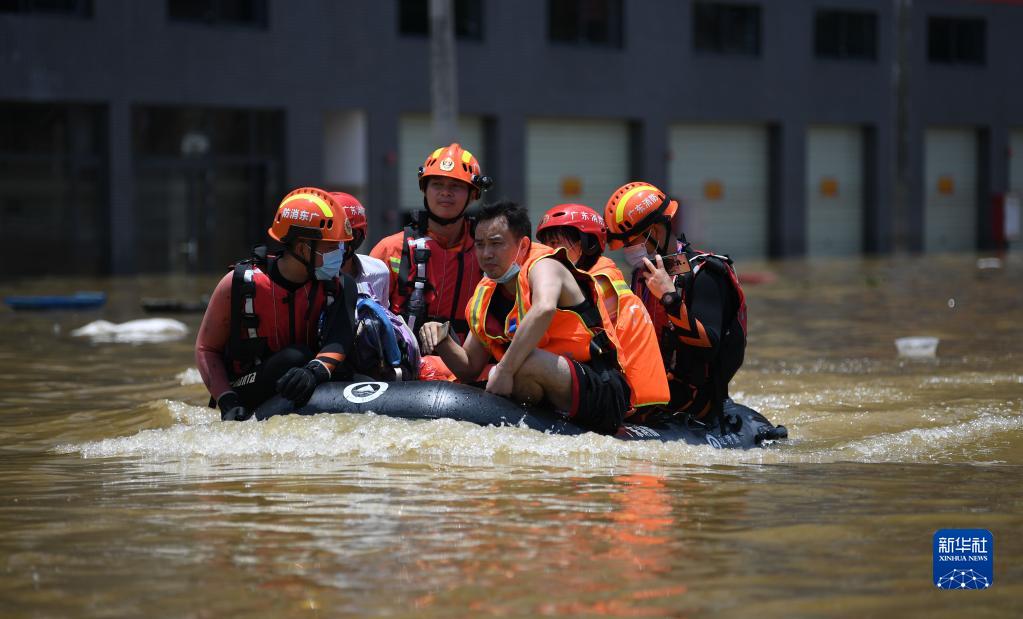 6月23日,在廣東清遠英德市浛洸鎮,救援人員用橡皮艇轉移群眾。新華社記者 鄧華 攝
