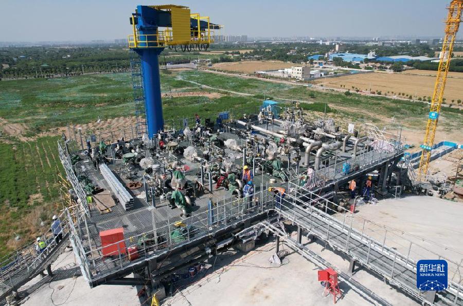 6月23日,中建安裝華西公司工人在西安液化天然氣(LNG)應急儲備調峰項目現場1號儲罐泵井平臺上作業(無人機照片)。