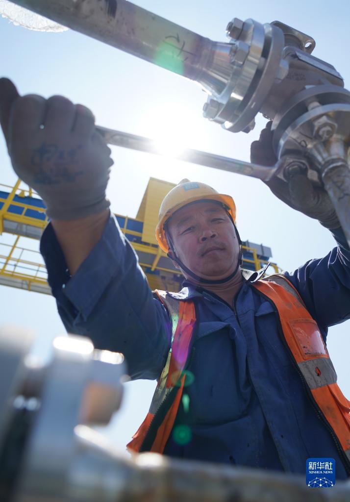 6月23日,中建安裝華西公司工人在西安液化天然氣(LNG)應急儲備調峰項目現場1號儲罐泵井平臺上安裝設備。
