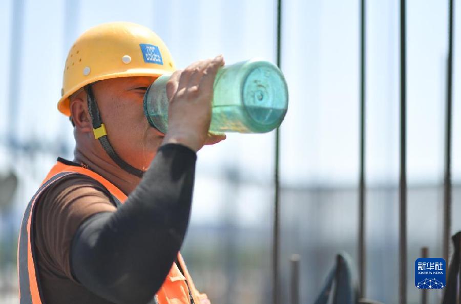 連日來,陜西多地持續高溫,在部分重點項目施工現場,城市建設者們堅守崗位、默默奉獻。為應對高溫帶來的不利影響,承建單位采取分段錯時施工、發放降溫消暑用品等方式為施工人員提供保障。新華社記者 張博文 攝