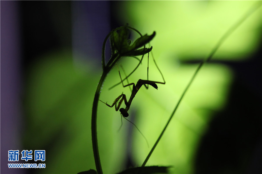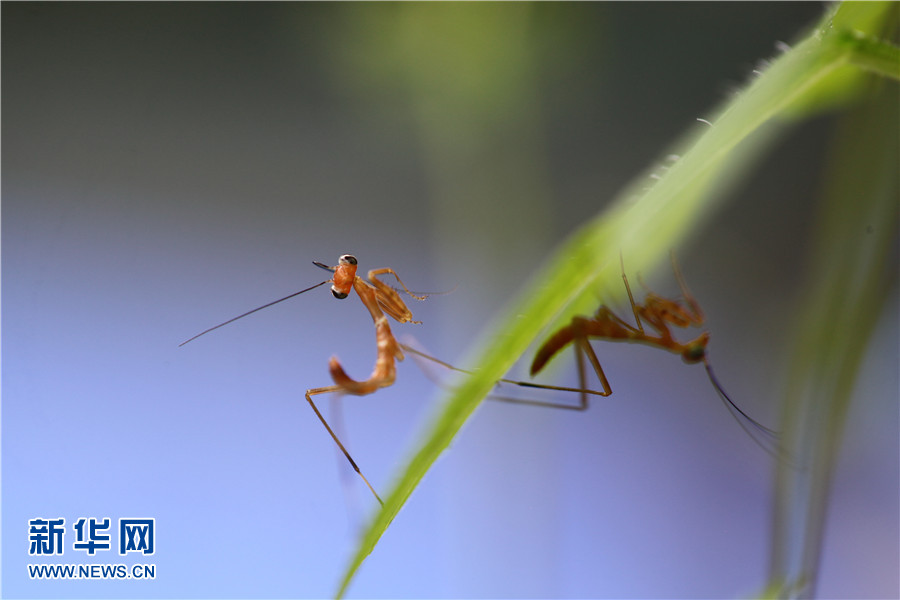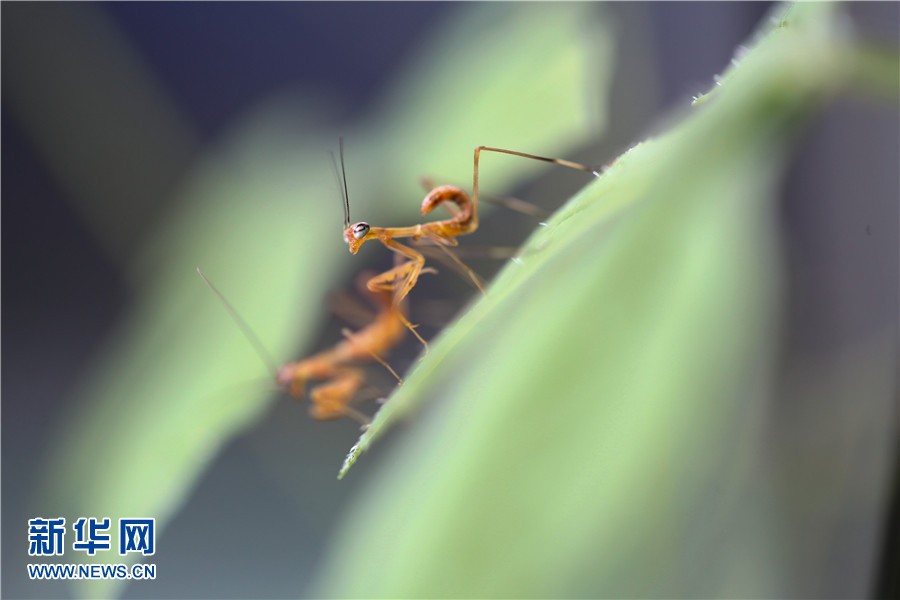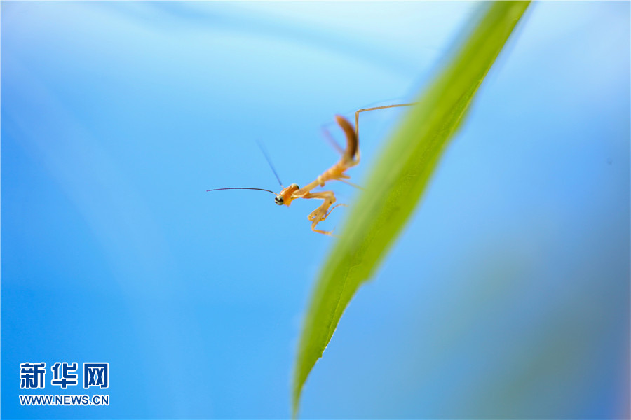 螳螂寶寶歪著腦袋四處張望(6月26日攝)。