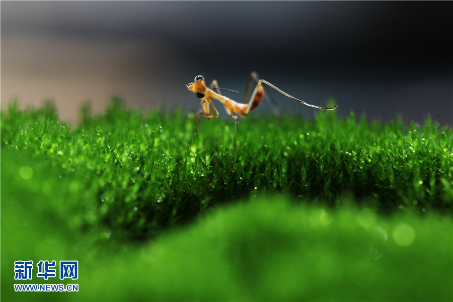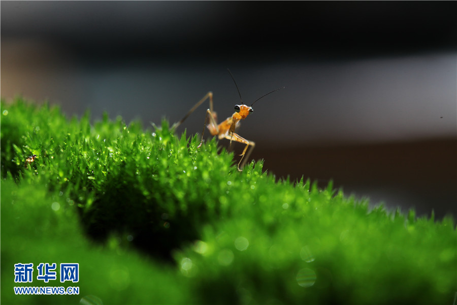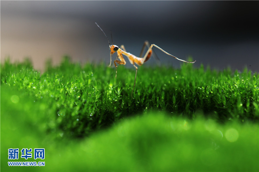 螳螂寶寶在苔蘚上“散步”(6月26日攝)。