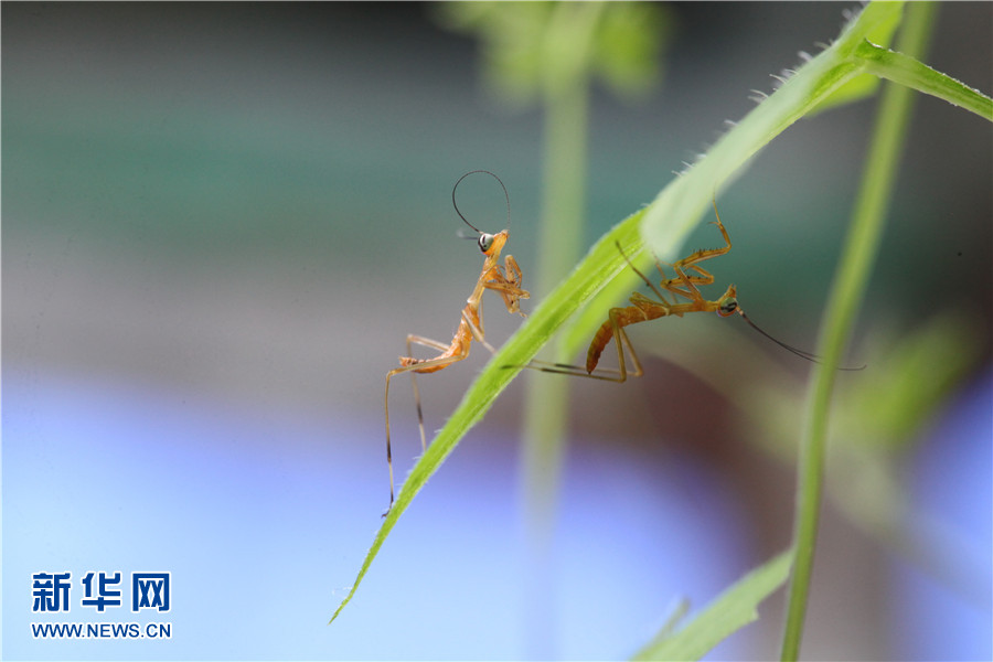 兩只螳螂寶寶在植物葉面上(6月26日攝)。