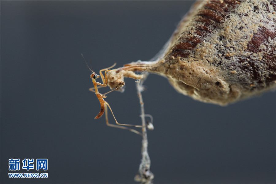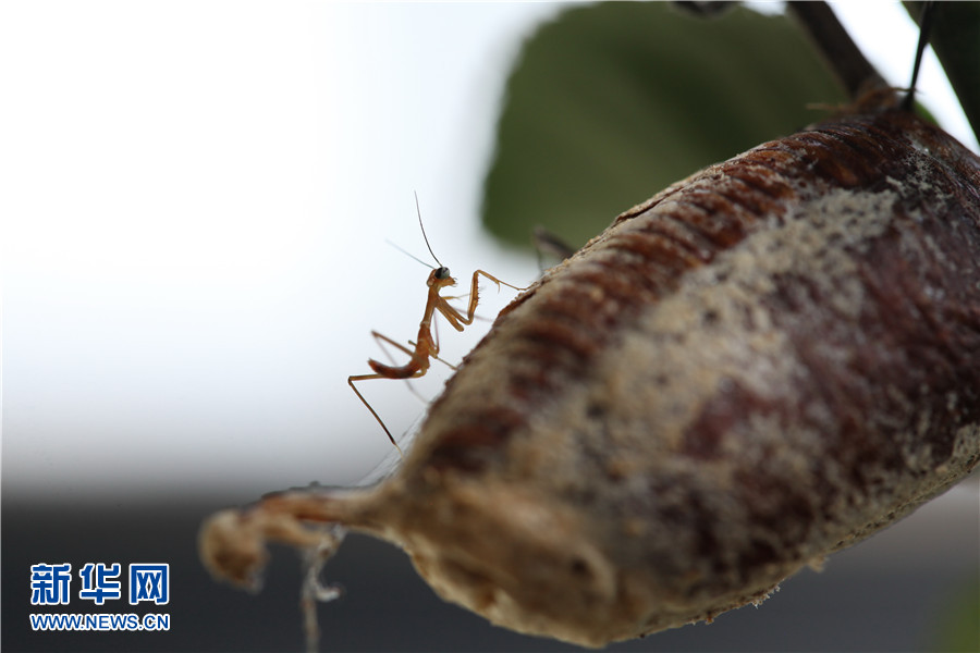 螳螂寶寶在卵鞘上爬行(6月26日攝)。