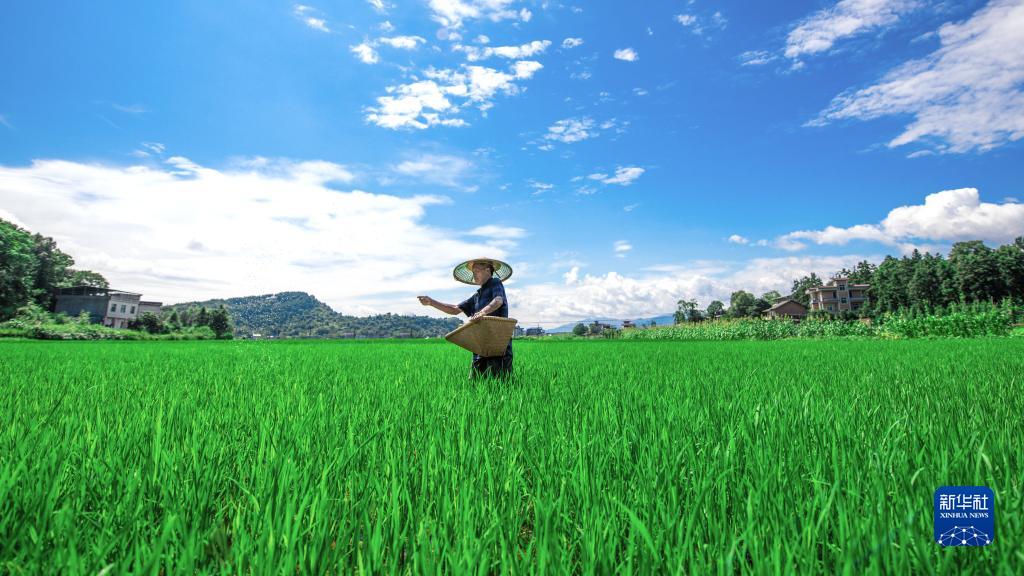 7月5日,在湖南省常寧市蘭江鄉蘭田村,農民在給水稻施肥。新華社發(周秀魚春攝)