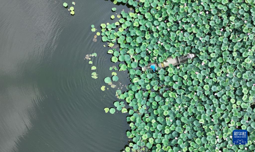 7月5日,在浙江省湖州市德清縣康乾街道聯合村,蓮農在荷塘采摘蓮蓬(無人機照片)。新華社發(謝尚國攝)