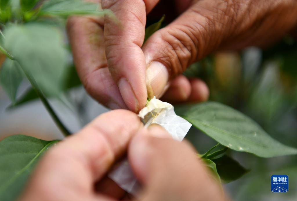 7月5日,農技人員在貴州省遵義市官莊辣椒科技示范基地給辣椒授粉。新華社發(羅星漢攝)