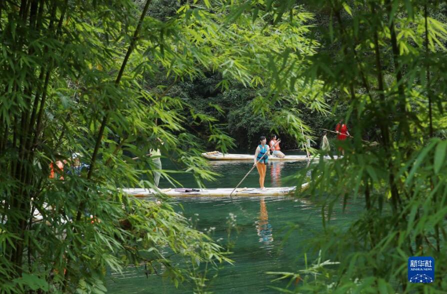 7月16日,游客在湖北省宜昌市秭歸縣三峽竹海生態景區體驗竹筏親水項目。