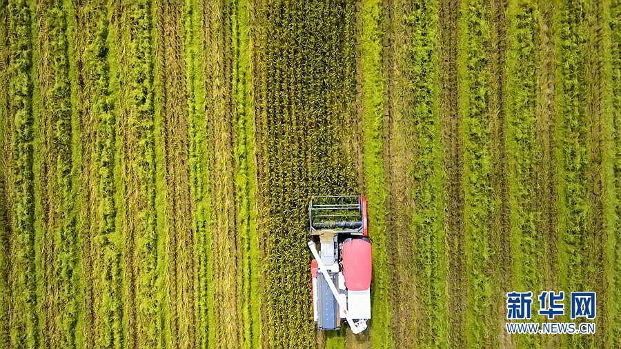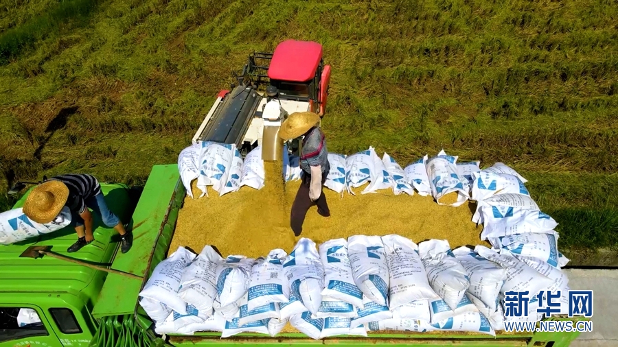 當地農民利用晴好天氣搶抓農時收割早稻。新華網發(胡東和 攝)