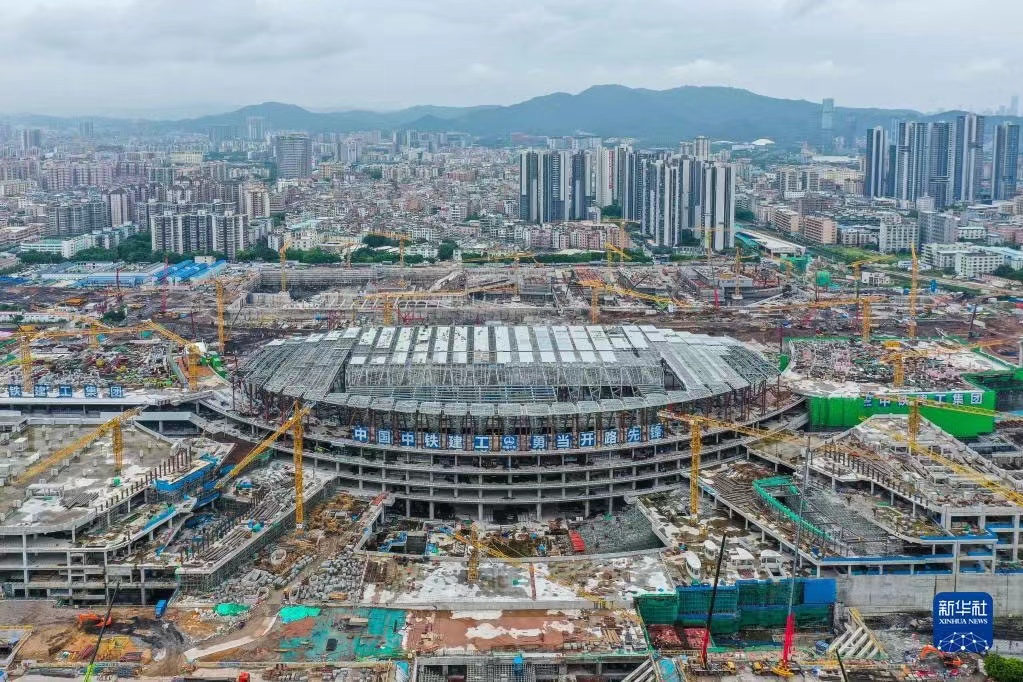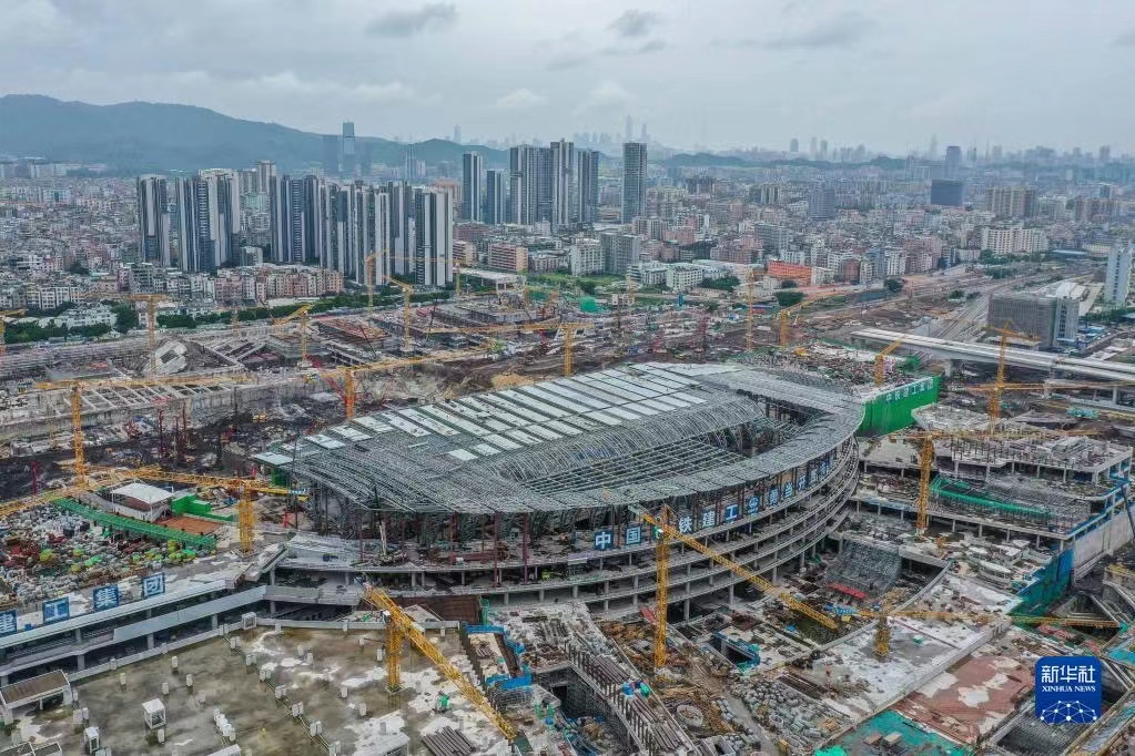 這是8月4日拍攝的建設中的廣州白云火車站(無人機照片)。新華社記者 劉大偉 攝