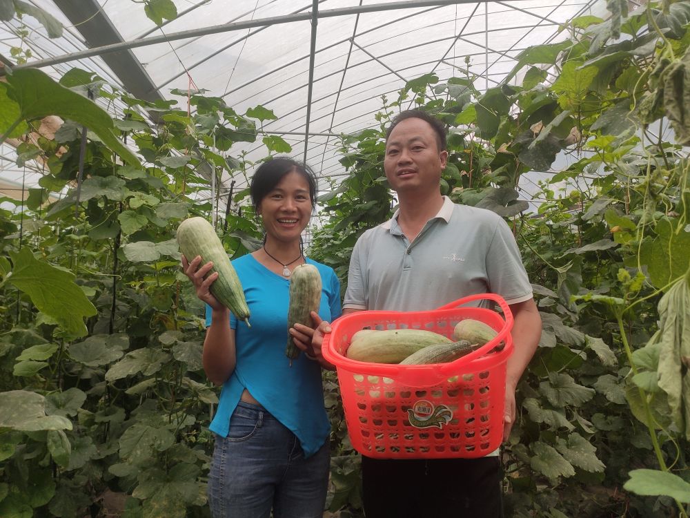 6月15日,在江西贛州市贛縣區茅店鎮東田村,張燕平、范春連夫婦在自家的大棚里采摘瓜果。新華社記者姚子云攝