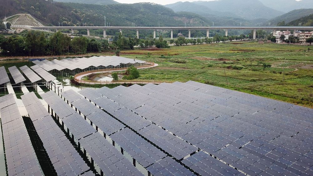 2022年4月26日,位于廣東省河源市龍川縣佗城鎮佳派村的魚塘上方安裝了太陽能發電板,形成“上可發電、下可養魚”的模式。新華社記者 李思佳攝