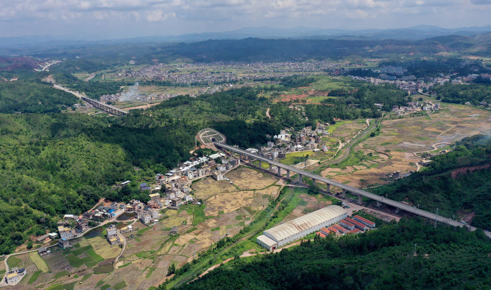 2022年4月26日,港深高鐵經過廣東省河源市龍川縣佗城鎮佳派村。新華社記者 李思佳攝