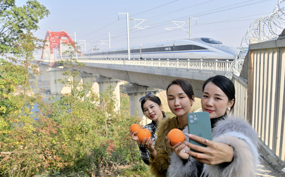 2021年12月10日,幾名游客在江西信豐縣嘉定鎮勝利村附近的贛深高鐵彩虹橋旁合影留念。(受訪者供圖)
