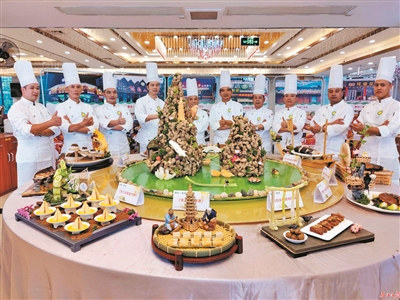 “肇慶一桌菜”的造型,是用生姜堆砌而成的七星巖風景,十道肇慶名菜繞“山”而擺,頗為壯觀。