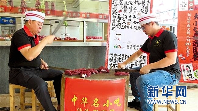 新華網廣州8月24日電(記者魏蒙)暑假假期,在位于廣東汕頭澄海的“潮式全牛宴制作技藝”非遺展示館,常見一群群中小學生,以參加研學,管窺吃起來嫩、爽、滑的涮火鍋之牛肉所需的精湛刀工,還興趣盎然地手操方形錘刀,嘗試著由“非遺”傳承人蔡德溪現場傳授的潮汕手打牛肉丸的傳統技藝。