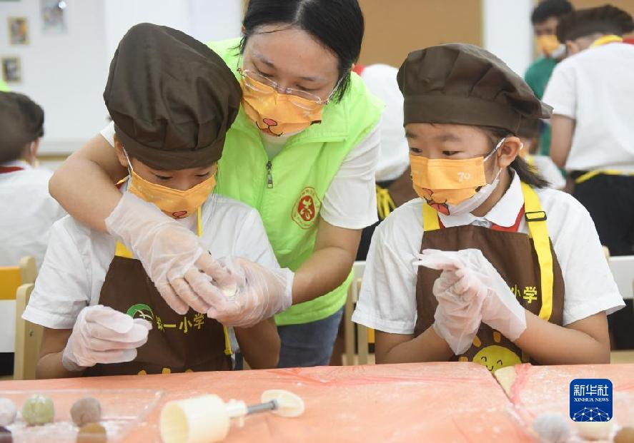 9月1日,廣州市鐵一小學的學生在勞動課上制作月餅。