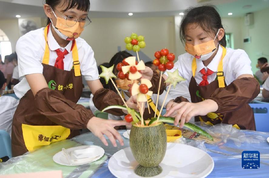 9月1日,廣州市鐵一小學的學生在勞動課上制作水果拼盤。