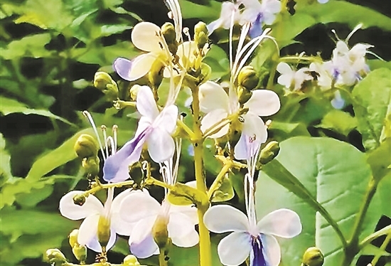 藍蝴蝶的花造型很美,圓錐花序從枝頂伸出,花蕾如小音符般嬌俏可愛,5枚圓形裂片的藍紫色杯形花萼,有四枚像蝴蝶翅膀那樣平展開來,另一枚不僅顏色更深,還格外長且卷,好像一只蝴蝶碩大的腹部,又像一根長長的尾巴。它的花量也很驚人,一個花枝上抽出一根花序,便能開出一長串花來,雖然花期只有短短幾天,但勝在此起彼伏,花開不斷?!趺缑?/p>