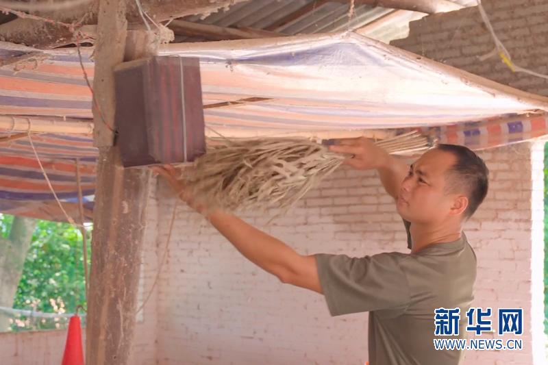 聶炬輝在細心清理音響上的灰塵,為雞營造安全、舒適、干凈的環境。新華網發(張羲輪 攝)
