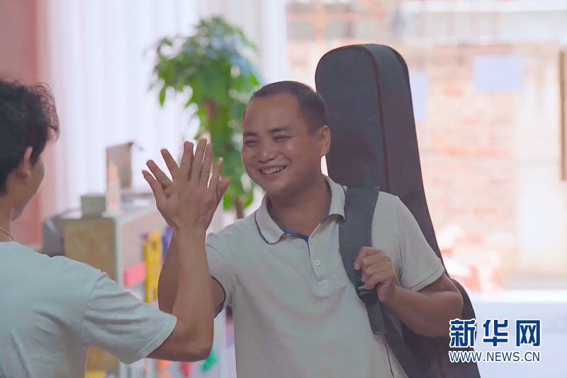 聶炬輝與樂隊成員擊掌,他表示,興趣是生活的態度,在把工作干好的過程中會不斷優化生活,提高生活質量。新華網發(張羲輪 攝)