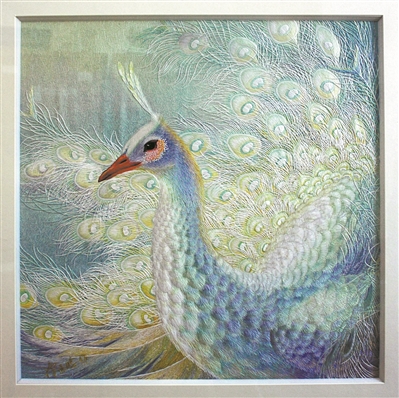 陳少芳、譚展鵬2011年創作的真絲絨繡作品《王者風范》是在真絲緞面上以蠶絲線刺繡的廣繡作品。作品以半身肖像的形式表現白孔雀高傲又純潔美麗的性格與特質。譚展鵬介紹:“廣繡極少表現白孔雀,在構圖中我借鑒綠孔雀的尾翎結構進行白孔雀尾屏的設計,豐富藝術手法,強化工藝美術的視覺效果?!濒嵫壑羞\用了早已失傳的“反咬針”??兹傅念^、頸、胸是按白的主體冷、暖色變化,配合傳統針法的互相轉換與重組,表現出各部位的毛發的質感和立體感。對眼睛的細致描繪也使白孔雀的神情更具有王者風范。作品于2021年獲中國(中山)紅木家具博覽會傳統工藝美術展“金藝杯”金獎。