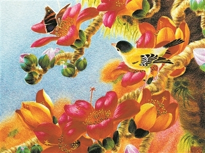 《紅棉璀璨》尺幅48厘米×42厘米,創作于2002年。廣繡大師陳少芳將廣州市市花紅棉與廣州市市鳥畫眉組合在一起,創造出一幅詩情畫意的畫面。畫面上,一只“畫眉鳥”與老朋友“花蝴蝶”喜相逢于“紅棉花”之間,一唱一和?!凹t棉”上的一顆“露珠”極顯細致的質感。作品以傳統廣繡常用的針法——平針繡、打籽針繡、亂針繡等去重新布局全新的視覺畫面,尤其是對逆光效果的探索,是當年突破傳統的成功創作之一。當年,作品以《現代廣繡精品畫》(四件套:《傲視群芳》《紅棉璨燦》《鳳冠蝶舞》與《白鷺芭蕾》)的名義參賽并獲“2002年廣州市旅游工藝品創作大獎賽”精品銀獎。