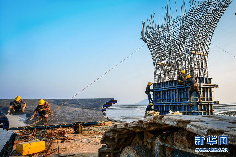 這里曾經是一片蝦塘荒地,如今一座現代化綠色化工和氫能產業園正在崛起。圖為2023年1月1日,施工人員用鋼筋水泥進行澆筑。新華網發 (劉武基 攝)