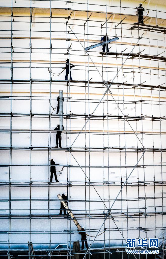 2023年1月1日,在建筑施工腳手架上,施工人員在傳遞著施工材料。新華網發 (劉武基 攝)
