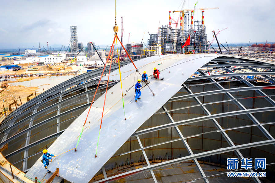 圖為2023年1月1日廣東茂名東華能源(茂名)烷烴資源利用項目一期工地現場,施工人員在搭建腳手架。新華網發 (劉武基 攝)