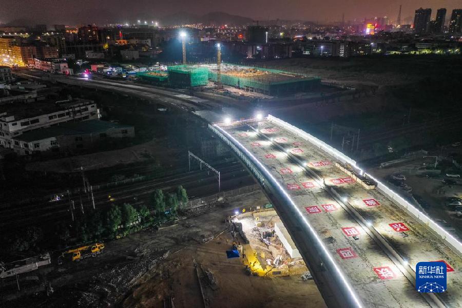 這是轉體成功后的轉體梁上跨廣深鐵路(1月4日攝,無人機照片)。