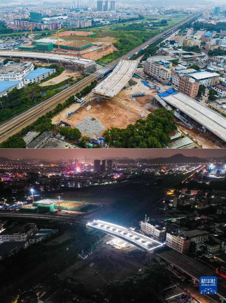 這是東莞環市南路上跨廣深鐵路轉體梁轉體前后的拼版照片(上圖1月3日攝,下圖1月4日攝,無人機照片)。