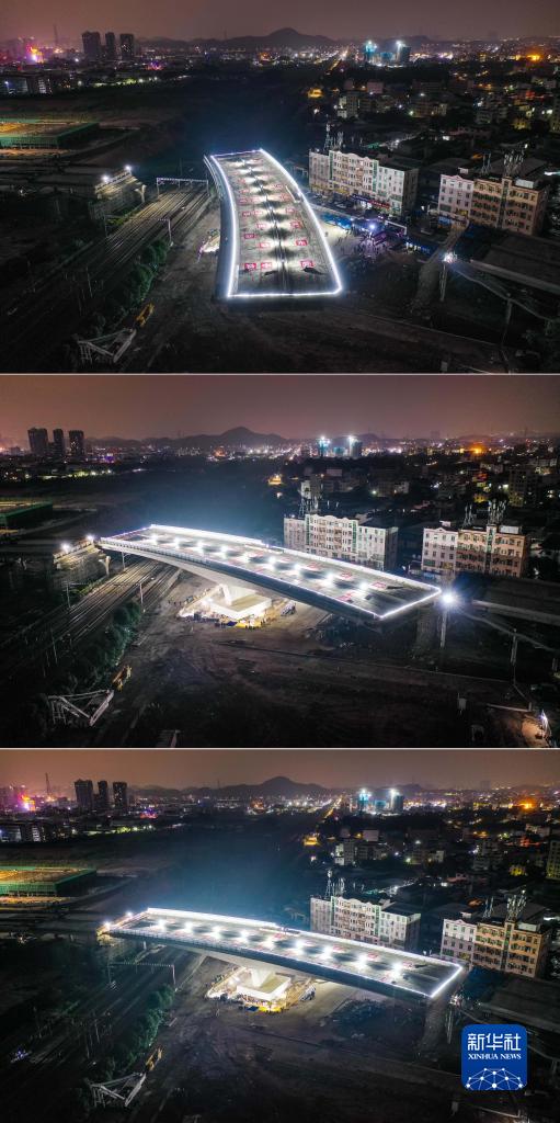 這是東莞環市南路上跨廣深鐵路轉體梁轉體過程的拼版照片(1月4日攝,無人機照片)。