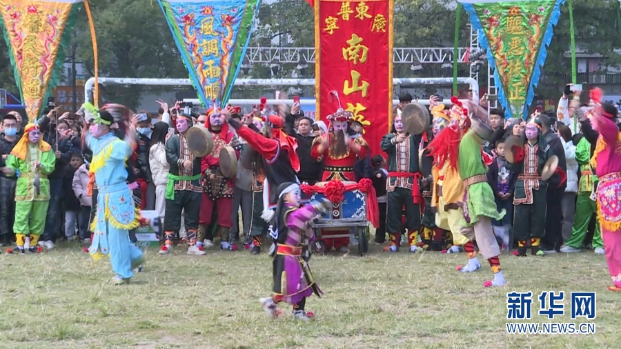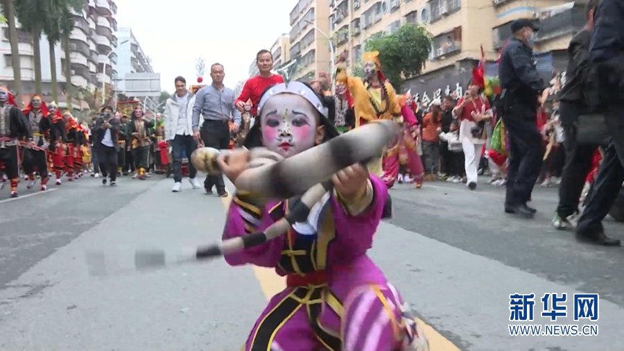 春節期間,廣東省普寧市市區鼓樂喧天,英歌舞在街頭表演,熱鬧喜慶賀新春。新華網發