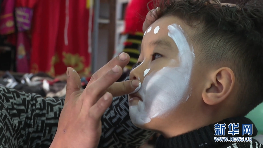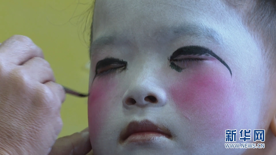 陳楷銘要配合表演的角色,給臉部涂粉。新華網發