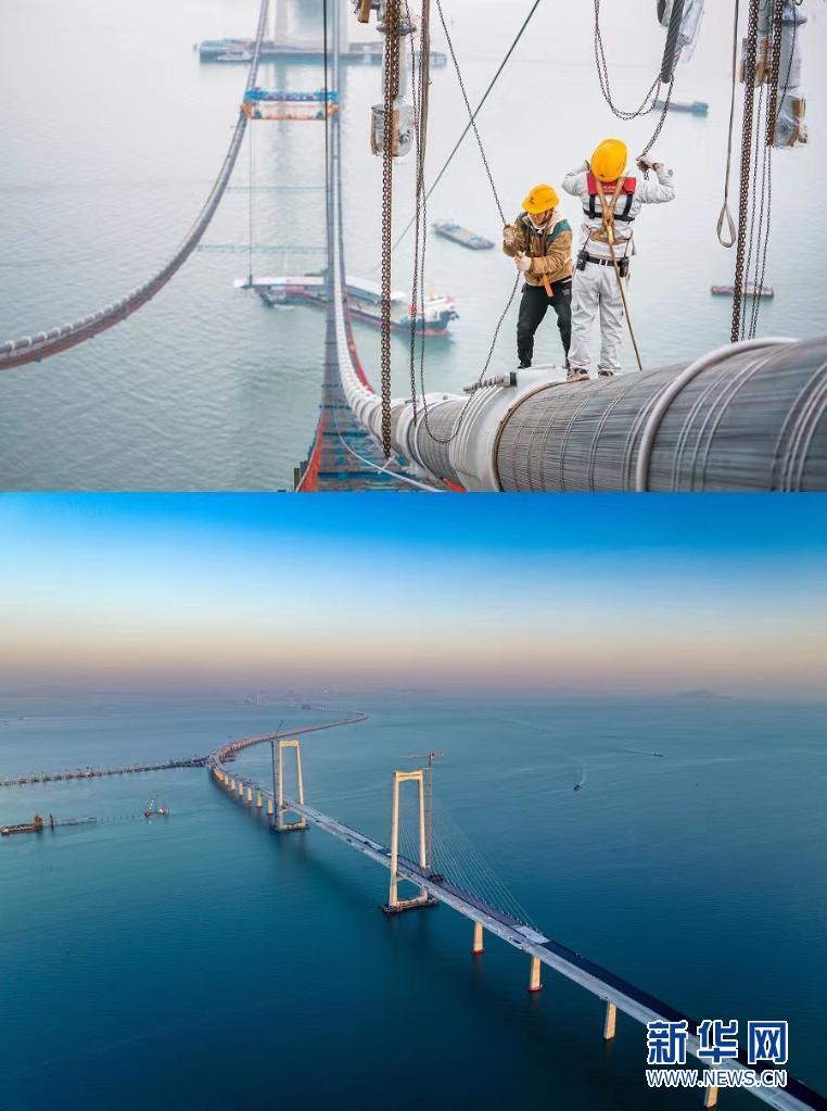 拼版照片:上圖為深中通道建設者開展施工作業(蘇振飛 攝);下圖為深中通道全線建設現場(明朗 攝)。新華網發