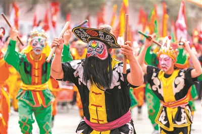 踏著嘭嘭作響的鼓點,一群年輕人手舞“英歌槌”,臉涂油彩妝,“化身”英雄好漢,變換著隊形大踏步而來,動作整齊劃一,喊聲氣貫長虹。2月6日,一場氣勢磅礴的英歌舞表演在揭陽市揭東區錫場鎮前圍村上演。時隔三年后,前圍村再度在正月十六舉辦一系列迎春接福、游神賽會活動,將兔年春節的喜慶氛圍推向高潮。
