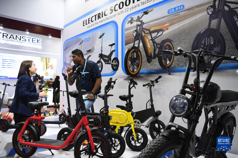 4月15日,采購商(右)和電動自行車參展商在廣交會上交流。新華社記者 鄧華 攝